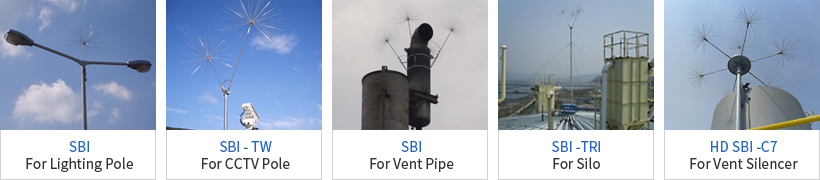 SBI는 벤자민 프랭클린 형태의 일반 피뢰침에 의하여 접지와 연결하여 낙뢰를 유도하는 방식과 이온방산방식에